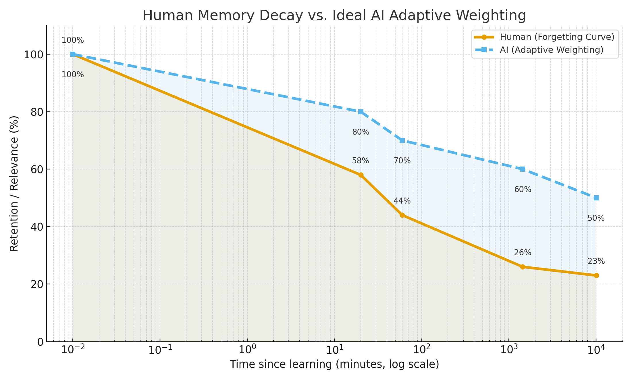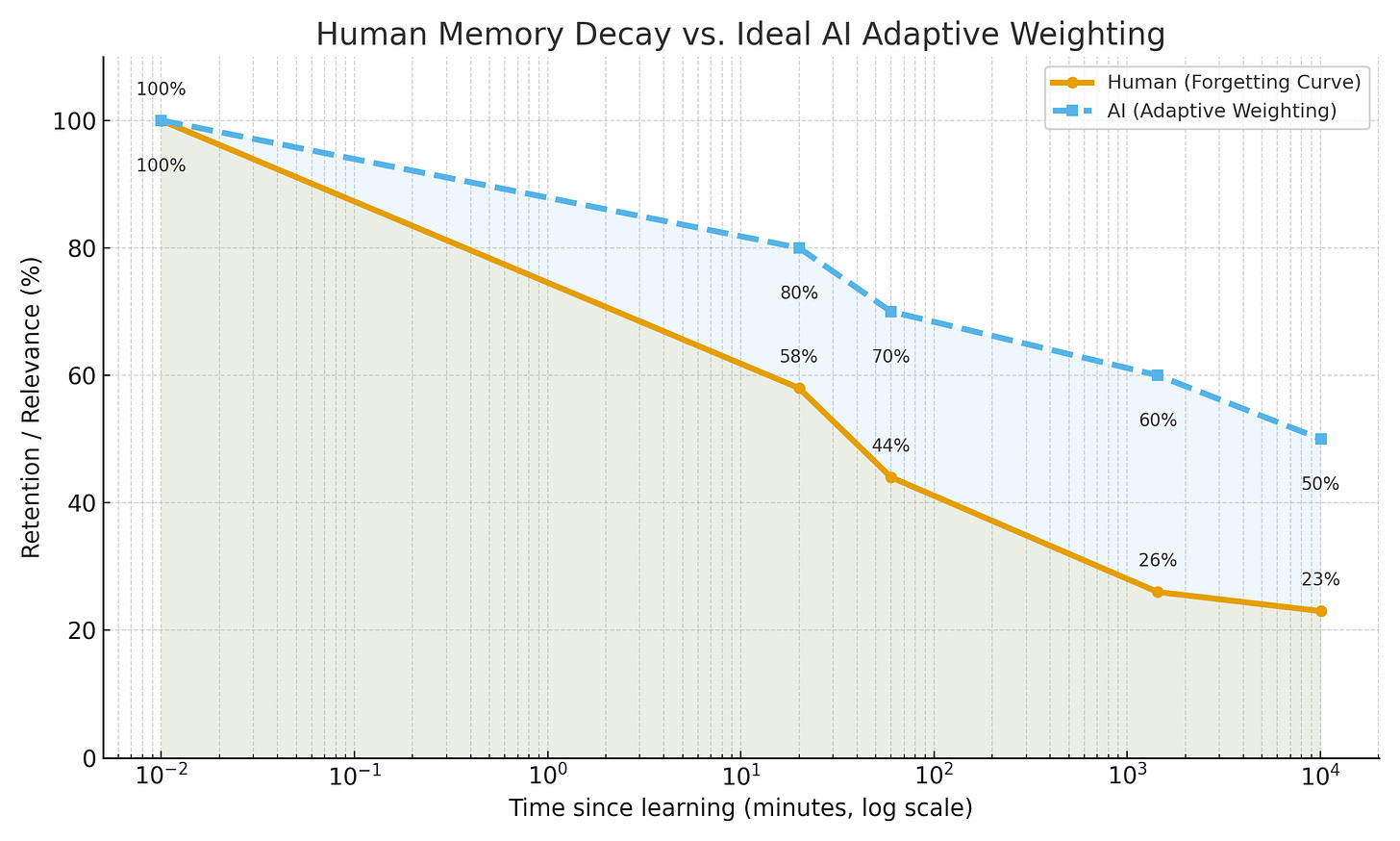 Human Memory Decay vs. Ideal AI Adaptive Weighting