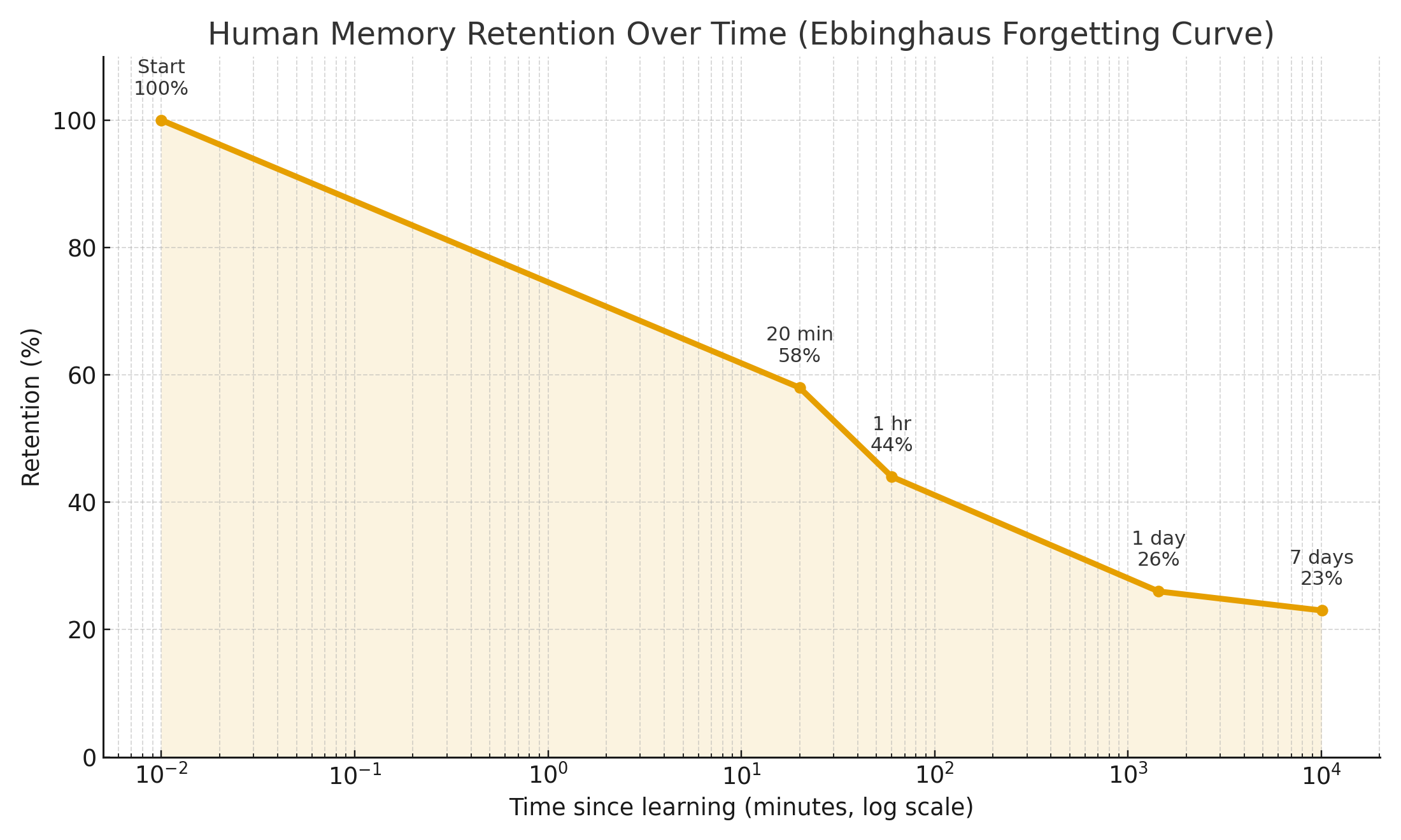 This classic curve, first described by Hermann Ebbinghaus in 1885, shows how human memory decays over time without reinforcement. Retention drops steeply within the first hour, then declines more gradually across days and weeks. Learn more on Wikipedia: Forgetting curve: https://en.wikipedia.org/wiki/Forgetting_curve